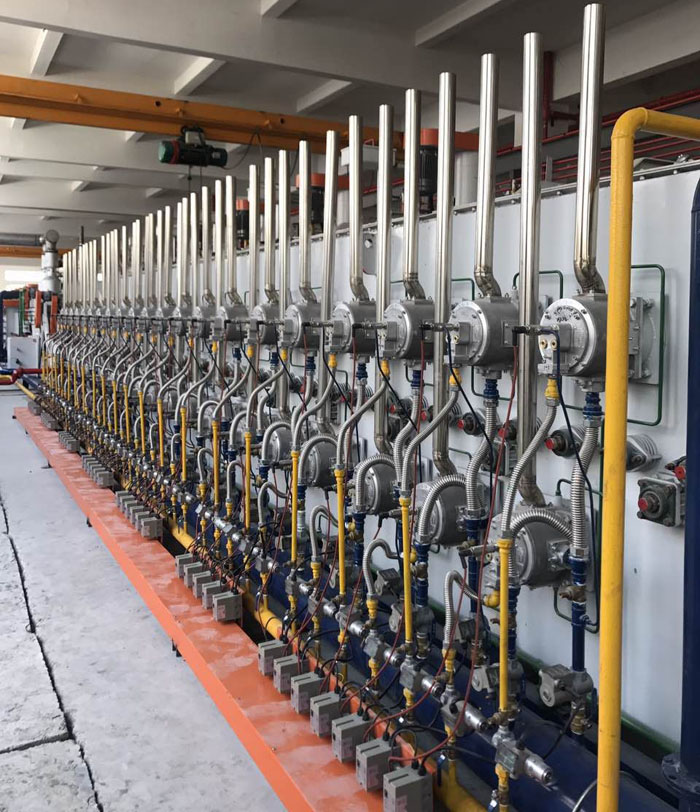 設備概要及特長 1.概要 1.1本熱處理生產線采用日本中外爐技術和電阻爐行業標準制造、檢驗,關鍵部件采用進口產品,整體制造裝配品質達到國內先進水平。 1.2本生產線由磁性上料、淬火、淬火冷卻、清洗、回火和冷卻等工藝組成全自動流水線。 2.生產線特長 2.1主爐采用變壓器低電壓大電流加熱,大大提高輻射管壽命和維修更換方便。 2.2網帶采用托輥同步傳動,使網帶運行時承受Z小張力,延長使用壽命。 2.3托輥兩端支承采用NSK特殊耐高溫自潤軸承,軸承散熱座采用全鋁結構強度可靠。 2.4網帶傳動設計有過載、跑偏異常報警系統裝置,保證網帶運行平衡可靠,不跑偏卡死。控溫系統采用PID自動控制,配置異常超溫報警系統并配置必要的連鎖。 2.5采用滴注式氣氛,保護氣氛采用爐內進行高溫裂解,使用簡單可靠,可避免滴注管口發生積碳現象。碳勢由氧探頭和碳控儀進行自動控制,氧探頭由保護儀自動燒炭。 2.6風機上的高速旋轉軸承均采用日本NSK軸承,保障風機平穩運行的可靠性。
